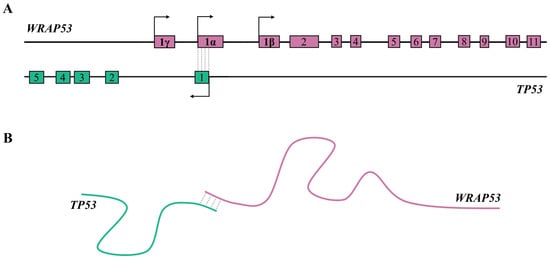 A key tumor suppressor gene, p53, is a transcription factor whose function has been identified in numerous biological processes, including metabolism, senescence, or cell cycle arrest and apoptosis in response to cellular stress [88,89,90]. To avoid this response, p53 is often inactivated in cancer cells, allowing survival and tumor progression [89]. The identification and characterization of natural antisense transcript Wrap53 positioned opposite to the p53 DNA strand revealed that both genes overlap at the 5′ ends (Figure 2A) [88]. The Wrap53 termed for WD40-encoding RNA antisense to p53 encodes the WRAP53 protein (also denoted WDR79), crucial for cellular trafficking of small Cajal body-specific RNAs (scaRNAs) and recruitment of the telomerase enzyme to Cajal bodies [91,92,93]. Wrap53 utilizes three alternative transcriptional start sites (1α, 1β, and 1ɣ) [92]. Usage of distal TSS (1α) results in the elongation of 5′UTR of the transcript described as WRAP53-1α. WRAP53-1α directly overlaps the first exon of the p53 gene and regulates p53 mRNA at the transcriptional level [88]. Studies revealed that both genes interact at the 5′ ends, increasing the stability of p53 mRNA and enhancing the production of the p53 protein in response to cellular stress [88,94]. It has been found that Wrap53 regulates p53 via RNA:RNA hybridization (Figure 2B). Inhibition of Wrap53/p53 duplex formation reduces p53 abundance, confirming that this RNA:RNA interaction protects p53 from degradation and sustains its expression in human cells [88]. Since the p53 expression level is regulated by Wrap53, any alterations of Wrap53 levels could contribute to tumorigenesis [92]. Over-expression of Wrap53 has been associated with several types of tumors, including head and neck squamous cell carcinoma (HNSCC) [94,95], development of esophageal squamous cell carcinoma (ESCC) [96], or tumor progression in non-small cell lung cancer (NSCLC) [97].