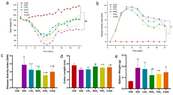 Vitamin K2 (VK2) administration ameliorated ulcerative colitis. (a) Daily weight variation. (b) Daily disease activity index (DAI) changes. (c) DAI scores on day 21. (d) Colon lengths. (e) Spleen weights. We report the results as means ± SDs, and n = 8. We determined the statistical significance using a one-way ANOVA with LSD comparison adjustment. * p < 0.05 and ** p < 0.01 in comparison to the CON group; # p < 0.05 and ## p < 0.01 in comparison to the DSS group.