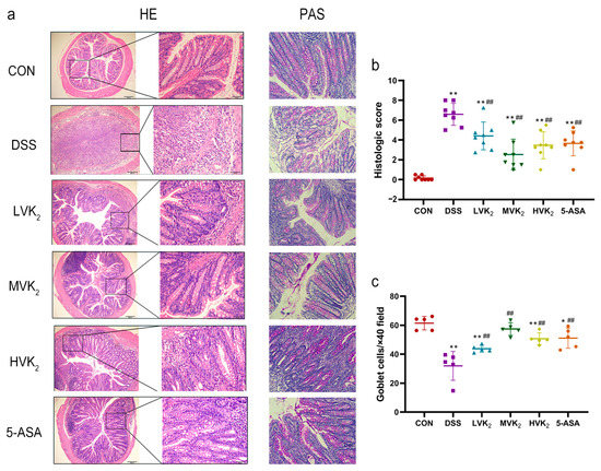Hematoxylin and eosin (H&E) staining was used to systematically assess the damage to the intestinal mucosa. The mice in the VK2 and 5-ASA groups showed less inflammatory cell infiltration, relatively intact colonic architectures, less mucosal damage, and lower histology scores than the mice in the DSS group, which displayed loss of crypts, infiltration of the mononuclear cells, severe mucosal damage, and higher histology scores (Figure 2a,b). Periodic acid-Schiff (PAS) staining results (Figure 2a,c) showed that DSS considerably reduced the number of intestinal goblet cells (p < 0.05). The oral administration of VK2 and 5-ASA restored the loss of intestinal goblet cells brought on by DSS (p < 0.05). According to these results, the VK2 treatment substantially ameliorated the DSS-induced ulcerative colitis.