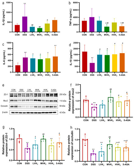 Furthermore, in the DSS group, the protein expression levels of ZO-1 and occludin in the colon tissues of the mice were considerably lower than those in the CON group (p < 0.01, Figure 3g,h). After supplementation with VK2 and 5-ASA, ZO-1 and occludin protein expression levels were elevated compared with the DSS group, with statistically different results in the MVK2 and 5-ASA groups (p < 0.01, Figure 3g,h). In addition, the reduction in the protein expression of muc2 induced by DSS was reversed in the MVK2, HVK2, and 5-ASA groups (p < 0.05, Figure 3f).