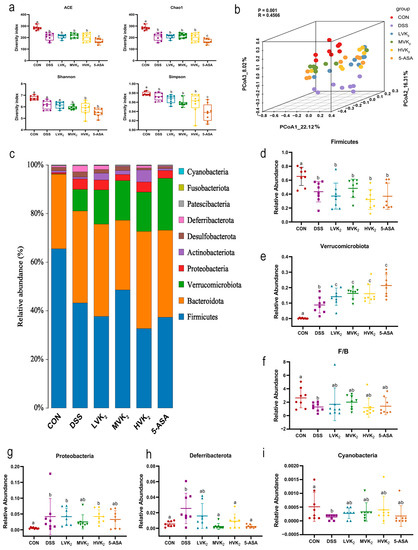 Intestinal flora diversities and compositions in various groups. (a) Alpha diversity. (b) PCoA analysis (Bray–Curtis distance matrices). (c) Bar plots of taxonomic compositions at the phylum level. (d–i) Different bacteria at the phylum level. We report the results as means ± SDs, and n = 8. Based on the one-way ANOVA with LSD multiple comparison method, different letters denote that results were markedly different at the level of p < 0.05.