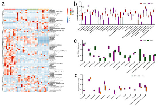 Vitamin K2 (VK2) changed relative abundances of intestinal flora at genus level. (a) Community heatmap of relative abundances of intestinal flora at genus level in CON, DSS, MVK2, and 5-ASA groups. Blue indicates less change in a specific bacterium within the four groups, and red indicates more change. (b) Different bacteria (p < 0.05) between CON and DSS groups. (c) Different bacteria (p < 0.05) between DSS and MVK2 groups. (d) Different bacteria (p < 0.05) between DSS and 5-ASA groups. We report the results as means ± SDs, and n = 8. We used the Student’s t-test (unpaired, two-tailed) to calculate the significance levels.