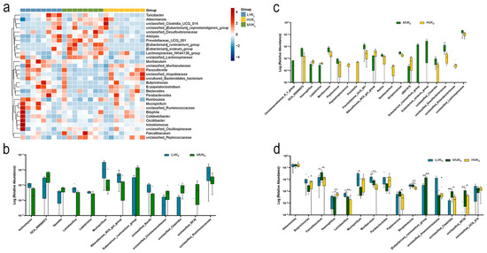 Differences in specific microbial taxa between VK2 intervention groups. (a) Community heatmap of relative abundances of gut microbiota at genus level in LVK2, MVK2, and HVK2 groups. Blue indicates less change in a specific bacterium within the four groups, and red indicates more change. (b) Different bacteria (p < 0.05) between LVK2 and MVK2 groups. (c) Different bacteria (p < 0.05) between MVK2 and HVK2 groups. We report the results as means ± SDs, and n = 8. We used the Student’s t-test (unpaired, two-tailed) to calculate the significance levels. (d) Comparison of abundance differences in crucial bacteria in vitamin K2 groups. We determined the statistical significance using a one-way ANOVA with LSD comparison adjustment. * p < 0.05 and ** p < 0.01 in comparison to the MVK2 group.