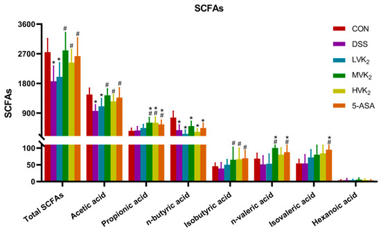 Levels of different SCFAs in cecal contents. We report the results as means ± SDs, and n = 8. We determined the statistical significance using a one-way ANOVA with LSD comparison adjustment. * p < 0.05 in comparison to the CON group; # p < 0.05 in comparison to the DSS group.
