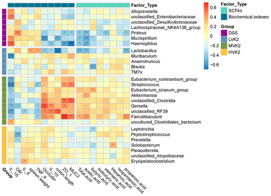 Correlations between intestinal flora and ulcerative colitis indexes. Spearman correlations between intestinal microbiota and biochemical indexes or SCFAs in DSS, LVK2, MVK2, and HVK2 groups. Blue and red colors indicate negative and positive correlations, respectively. The strength of the Spearman correlation correlates directly with the color intensity. * p < 0.05 and ** p < 0.01.