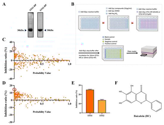 Screening STS1 and STS2 phosphatase inhibitors from natural small molecules. (A) Expression and purification of STS1 and STS2 histidine phosphatase (HP) domain recombinant proteins. Purified proteins were analyzed in 12% SDS−PAGE followed by Coomassie blue staining. (B) Schematic diagram of STS1 and STS2 phosphatase inhibitor screening. The reaction was carried out at room temperature. (C,D) Inhibition ratios of compounds (10 μg/mL) on STS1 (C) and STS2 (D) phosphatase activities. Probability values (p-value) indicate statistical significance. The green dot in the red circle represents baicalein (BC). (E) Inhibition ratios of BC (10 μg/mL) on STS1 and STS2 phosphatase activities (n = 6). The data represent the means ± SEM. (F) The chemical structure of BC.