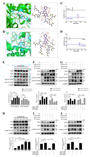 BC interacts with STS1 and STS2 HP domains and promotes phosphorylation of FLT3 and cKIT by inhibiting STS1 and STS2. (A,B) Molecular docking analysis of the binding of BC with STS1 (A) or STS2 (B). Left: The representative docking pose of BC with the HP domain STS1 (5VR6) or STS2 (5WDI). BC and the key residues of protein receptor are shown as sticks. The red dashed lines indicate the hydrogen bonds formed. Right: The 2D docked conformation showing the hydrophobic contacts (red eyelash shape) between BC and the HP domain of STS1 or STS2. (C,D) Capillary electrophoresis analysis of the binding of BC to STS1 (C) or STS2 (D). BC, STS1 or STS2 samples were prepared in 20 mM PBS at pH 7.0, and electrophoresis was run under 20 kV voltage. Red (C) or blue (D) arrows represent STS1 or STS2 protein peaks, respectively. (E,H) HEK293T cells were transiently transfected with FLT3 (E) or cKIT (H) constructs, and 48 h later, cells were stimulated with 10 μg/mL BC for different periods of time at 37 °C. Phosphorylated FLT3 (p−FLT3) or cKIT (p−cKIT) and endogenous STS1/STS2 proteins were detected by Western blot (n = 3). GAPDH was used as internal control. (F,G) FLT3 construct was transfected into HEK293T cells together with or without pcDNA−STS1 (F) or −STS2 (G). Then, 48 h later, cells were stimulated with BC for 2 min at 37 °C. The overexpressed proteins and phosphorylated FLT3 were detected by Western blot (n = 3). Vec indicates empty vector control. (I,J) cKIT construct was transfected into HEK293T cells together with or without Flag−tagged STS1 (I) or STS2 (J). Then, 48 h later, cells were stimulated with BC for 2 min at 37 °C. The overexpressed proteins and phosphorylated cKIT were detected by Western blot (n = 3). Vec indicates empty vector control. All data are shown as mean ± SEM, ** p < 0.01 (Student’s t test).