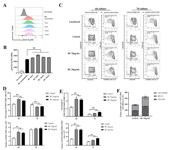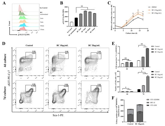 FLT3 and cKIT are expressed in hematopoietic cells and are essential for the self-renewal and differentiation of HSPCs; therefore, they play key roles in the hematopoiesis process [24,25,26]. As the above data showed that BC had the potential to activate FLT3 and cKIT via inhibiting the activities of STS1 and STS2, we next intended to investigate whether BC had any beneficial impact on HSPCs. To this end, bone marrow mononuclear cells (BMMNCs) were isolated from the C57BL/6 mouse and were treated by BC in an in vitro culture. First, the effects of BC on the phosphorylation of FLT3 and cKIT in BMMNCs were assessed by flow cytometry. We used flow cytometry but not Western blot here because only a very small proportion of BMMNCs are HSPCs expressing FLT3 and cKIT, and we failed to detect p-FLT3 or p-cKIT in Western blot. Flow cytometry analysis using anti-p-FLT3 Tyr591 antibody showed that upon BC treatment for 2–15 min, the mean fluorescence intensity (MFI) was dramatically increased in BMMNCs (Figure 3A,B) compared to the untreated control, indicating the elevation of the p-FLT3 Tyr591 level by BC. For anti-p-FLT3 Tyr842 or anti-p-cKIT Tyr719 detection, the MFI was also increased to a different degree upon BC treatment, although the overall intensity was very low, perhaps because the antibodies may not be suitable for a flow cytometry assay (Figure S1A–D). These results suggest that BC may activate FLT3 or cKIT in mouse BMMNCs in vitro. Then, the mouse BMMNCs were cultured in the presence of 10 μg/mL or 20 μg/mL BC for up to 17 days in vitro. We found that the cell numbers of BC-treated groups were significantly dose-dependently higher than the control group (DMSO) at each time point, suggesting that BC induced a faster proliferation of BMMNCs (Figure 3C). The BMMNCs are a heterogeneous cell population, so we further performed a phenotypic analysis of HSPCs via flow cytometry using multiple marker combination. The results showed that the Lineage−Sca1+cKIT+ (LSK) cell population in BMMNCs cultured with BC for 4 days or 7 days was dose-dependently increased to a remarkable degree (Figure 3D,E). These data indicate that BC led to HSPC proliferation over 7 days of culture, and 20 μg/mL BC might be a more optimal dose (Figure 3E). To explore the impact of BC on the function of HSPCs cultured in vitro, BMMNCs treated with 20 μg/mL BC after 7 days were used to perform the CFU assay. As shown in Figure 3F, we found a significant increase in the total colony number in the BC-treated group compared with the control group. Morphological classification of multipotent progenitor-cell-derived colonies showed a comparable increase in colony numbers of granulocyte and macrophage (CFU-GM) and burst-forming unit-erythroid (BFU-E), indirectly reflecting that there was no lineage skewing of hematopoietic progenitor cells (HPCs) after BC treatment (Figure 3F). The number of granulocyte-erythrocyte-monocyte-megakaryocyte colonies (CFU-GEMM) also had a slight increase compared with the control group but did not reach statistical significance (Figure 3F). Collectively, the above results demonstrate that BC can enhance the expansion and short-term self-renewal capacity of mouse HSPCs cultured in vitro, and activation of FLT3 and cKIT by BC through inhibiting STS1/STS2 may be one of the underlying mechanisms.