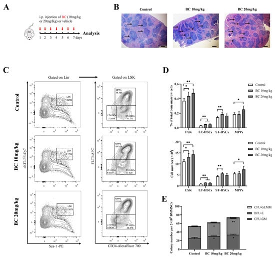 BC administration increases the proportion of HSPC population and colony−forming ability of BMMNCs in healthy mice. (A) Experimental schematic of BC administration in healthy mice. C57BL/6 mice were administered once daily with BC (10 or 20 mg/kg) or vehicle by intraperitoneal (i.p.) injection for 7 days (n = 5). Mice were sacrificed 24 h after the last injection. B6 represents C57BL/6 mice. Red arrows indicate BC injection timepoints. (B) Histological analysis of spleen tissues by hematoxylin and eosin (HE) staining. Scale bar: 200 μm. Black arrows indicate the white pulp of spleen. (C) Representative flow cytometry profiles showing the percentage of LSK (left), LT−HSCs (LSKCD34−FLT3−), ST-HSCs (LSKCD34+FLT3−) and MPPs (LSKCD34+FLT3+) (right) in BMMNCs from control or BC (10 or 20 mg/kg) treated mice. Gates shown identify the LSK populations from Lineage− (Lineage negative cells) and the LT−HSC, ST−HSC and MPP populations from LSK cells. (D) The proportions and absolute number of LSK, LT−HSCs, ST−HSCs and MPPs in BMMNCs from control or BC (10 or 20 mg/kg) treated mice in flow cytometry analysis as shown in (C) (n = 5). (E) The numbers of CFUs formed by BMMNCs from control or BC (10 or 20 mg/kg) treated mice (n = 3). All data are shown as mean ± SEM, * p < 0.05, ** p < 0.01 (Student’s t test) versus control.
