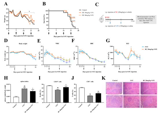 We next investigated the effects of BC on bone marrow hematopoietic function of 5-FU-injured mice (Figure 6C–K and Figure 7). Mice were again pretreated with 20 mg/kg BC or vehicle for 3 consecutive days followed by an injection of a lethal dose of 5-FU once a week, but they were sacrificed 7 days after the second cycle of 5-FU injection (Figure 6C) and subjected to designated evaluations. Besides ameliorating the loss of body weight as shown in Figure 6A (Figure 6D), BC pretreatment also improved the number of white blood cells (WBC) and platelets (PLT) but not red blood cells (RBC) to different degrees in the peripheral blood of 5-FU-injured mice (Figure 6E–G). In addition, control mice with 2 cycles of 5-FU injection displayed an excessive increase in the spleen index (Figure 6H) but a decrease in the proportions of CD19+ B cells and CD3+ T cells in the spleen (Figure 6I,J), which were, however, all relieved to some extent by BC pretreatment (Figure 6H–J). Histological analysis of the spleen showed that 5-FU induced splenic injury as indicated by disturbed white and red pulp structures, smaller germinal centers and obscure marginal zone between red and white pulp, while BC dosing prior to 5-FU injection obviously improved the histological structure of the spleen (Figure 6K). All the above data demonstrate that prophylactic administration of BC can enhance the survival and ameliorate the myelosuppression of mice that underwent multiple rounds 5-FU injection.