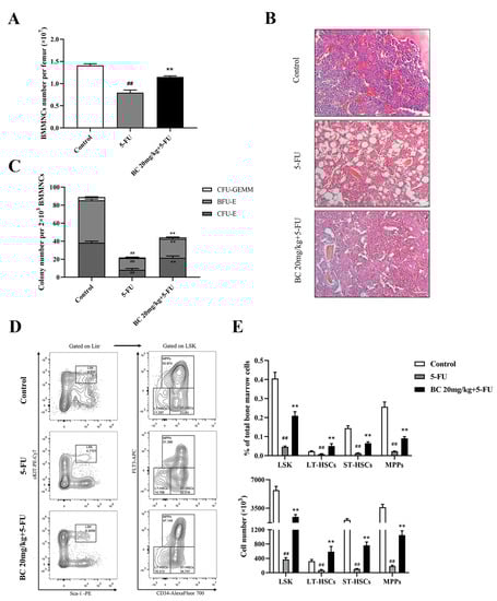 We finally analyzed the effect of BC pretreatment on 5-FU-induced impairment on bone marrow in mice, by which BC protected mice from lethal 5-FU toxicity. Counting of the BMMNCs and histological analysis of the bone marrow showed that BC pretreatment partially restored the cell number of BMMNCs which were markedly decreased upon 5-FU treatment (Figure 7A) and cellularity (Figure 7B) of bone marrow in 5-FU-injured mice. Furthermore, the reduced colony-forming ability of HSPCs in the bone marrow of 5-FU-injured mice was also partially rescued by BC pretreatment (Figure 7C). Importantly, subsequent flow cytometry analysis showed that the proportion and absolute number of the LSK population and LT-HSC, ST-HSC and MPP subpopulations in BM were significantly increased upon BC pretreatment compared with 5-FU-injured control mice (Figure 7D,E), suggesting that BC pretreatment effectively protected HSPCs from 5-FU-induced loss. These findings indicate that prophylactic administration of BC provides protection against 5-FU-induced BM damage.