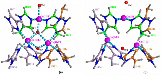 For QM calculations, the coordinates of non-hydrogen atoms were taken from X-ray data solved at subatomic resolution. Those X-ray data allowed us to assign the degree of oxidation to each copper ion position. It reduced QM optimization due to the fixation of copper ions and restrained the number of models studied compared to the previous research [