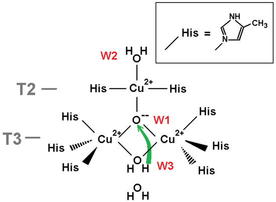 These results are in accordance with expectations. For oxygen ligand W3 as a hydroxyl ion, the induced polarization of an oxygen molecule would hardly be competitive with doubled energy of ionic pair OH−–Cu+ to approach the pair of copper ions T3. On the other hand, the competition between an induced dipole of molecular oxygen and a permanent dipole of a water molecule looks plausible enough.