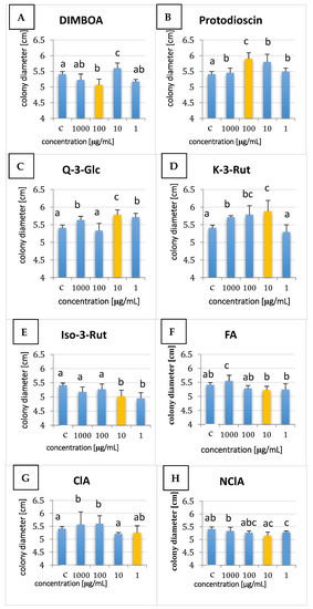 - Perincherry, L.; Witaszak, N.; Urbaniak, M.; Waśkiewicz, A.; Stępień, Ł. Effects of secondary metabolites from pea on Fusarium growth and mycotoxin biosynthesis. J. Fungi 2021, 7, 1004. [Google Scholar] [CrossRef] [PubMed]