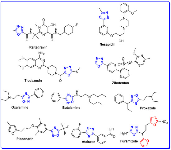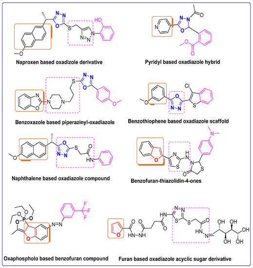 Various chemotherapeutics are available to cure different cancers, yet most of them suffer from certain drawbacks (being expensive, often having less efficacy than required, and carrying a lot of negative side effects) [10,11,12,13]. The development of new bioactive privileged structural motifs based on molecular recognition is the core and significant objective of medicinal chemistry. The oxygen and nitrogen containing heterocycles have always been of great synthetic/biological interest owing to their broad spectrum of applications in the fields of medicinal chemistry, pharmaceutics, and pharmacology. The compound’s structures innately lock the therapeutic potential against various diseases and diversified structures of heterocyclic scaffolds are the main dynamic source to act as biologically active therapeutics. Therapeutically, the heterocyclic oxadiazole is the one of the most famous pharmacophores of oxygen and nitrogen, containing a five member azole family that is an integral structural unit of various clinical drugs, as displayed in Figure 1. In general, the biological properties manifested by oxadiazole moiety bearing molecules include anti-fungal, anti-inflammatory, analgesic, anti-diabetic, anticancer, antibacterial, antiviral, antibacterial, antitumor, hypotensive, anti-obesity, etc. [14,15,16,17,18,19].