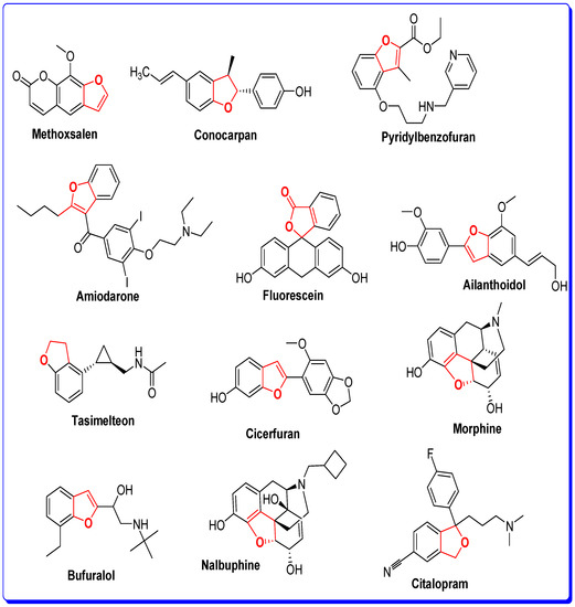As per recent literature, benzofuran derivatives also exhibit a wide spectrum of versatile biological activities, such as a bone anabolic agent, anti-inflammatory, antimicrobial agents, monoamine oxidase (MAO) inhibitors, tumor necrosis factor-α (TNF-α) inhibitors, anti-HIV/HCV, CNS related disorders, antipyretic, renal disorders, anticoagulant, anti-lung cancer, dual active ligands of 5-HT1A and serotonin reuptake inhibitors, anti-TB, farnesyltransferase (FTase) inhibitors, aromatase (cytochrome P450) inhibitors, Pim-1 serine/threonine-protein kinase inhibitors, hypoxia-inducible factor (HIF-1α) inhibitors, serotonin receptor inhibitors (5-HT1A), glycogen synthase kinase (GSK-3β) inhibitors, mammalian target of the rapamycin (mTOR) inhibitors, prolyl endopeptidase inhibitors (PEP), cholinesterase activity inhibitors, α-glucosidase inhibitors, tubulin polymerization inhibitors, anti-human liver carcinoma cell line (HepG2), serine-threonine kinase (AKT) inhibitors, PLK1 PBD inhibitors, PI3K/Akt inhibitors and VEGFR-2 tyrosine kinase inhibitors, etc. Some of the most famous benzofuran core based clinically active therapeutics have been depicted in Figure 2 [20,21,22,23,24,25,26,27].