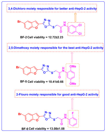It was observed that the second, fourth and fifth positions of phenyl were responsible for the excellent anti-HepG2 cancer activity of bromobenzofuran-oxadizoles BF1-9, especially of 2,4-dimethoxy containing a BF-5 derivative. The introduction of electron withdrawing groups (EWG), such as methoxy, flouro, and chloro on the second, fourth, and fifth positions of phenyl in the bromobenzofuran-oxadiazoles BF1-9, enhanced the cytotoxic potential while substituents pattern of the electron donating groups (EDG) on the phenyl of anilide ring decreased the cytotoxic therapeutic potential of bromobenzofuran-oxadiazoles BF1-9, as depicted in Figure 4 and Table 2. The effect of different substituents on the phenyl anilide ring displayed a vital role in cytotoxic behavior of bromobenzofuran-oxadiazole structural hybrids BF1-9.