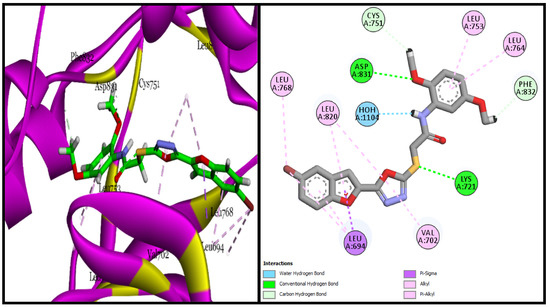 The investigations of these bromobenzofuran-oxadiazole compounds BF-2, BF-5, and BF-6 against the EGFR revealed that the bromobenzofuran-oxadiazole compound BF-5 showed greater efficacy in the in vitro studies; had a binding affinity of −15.17 Kcal/mol with its active site; and made two conventional hydrogen bonds with LYS721, ASP831, and two carbon-hydrogen bonds were observed with the CYS751 and PHE832 of the EGFR active site residues. A single water-assisted hydrogen bond as well as several stabilizing hydrophobic (Pi-sigma, Alkyl, and Pi-Alkyl) interactions were also made by this compound BF-5 with the active site amino acids of the EGFR enzyme and can be seen in Figure 5.