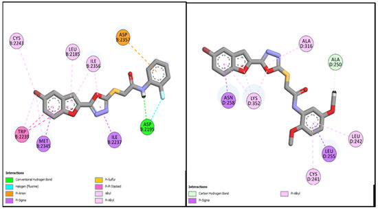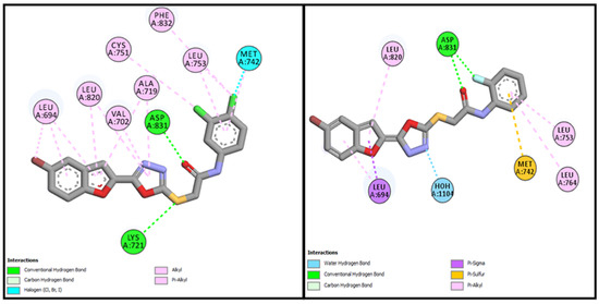 Similarly, the other two bromobenzofuran-oxadiazole compounds, BF-2 and BF-6, were able to bind with the active site of the EGFR with binding affinities of −14.17 Kcal/mol and −12.59 Kcal/mol, respectively. These two compounds (BF-2 and BF-6) also made significant interactions of different types by engaging the active site residues of EGFR via multiple hydrogen bonds and halogen interactions. These two bromobenzofuran-oxadiazole derivatives showed multiple hydrophobic stabilizing interactions and can be seen in Figure 6.