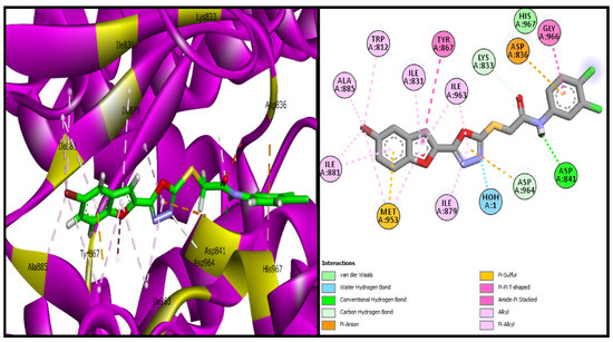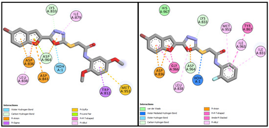 The other two lead compounds BF-5 and BF-6, which showed good efficacy in the in vitro investigations, also exhibited good binding affinities with the PI3K protein active site. Bromobenzofuran-oxadiazole compound BF-5 was able to bind with the PI3K active site with a binding affinity of −13.17 Kcal/mol and made water-assisted H-bond and two carbon-hydrogen bonds with the LYS833 and ASP964 active pocket residues; other hydrophobic type interactions, including Pi-Alkyl, Pi-Sigma, Pi-Lone Pair, Pi-Anion, and Pi-Sulfur interactions, were also observed between the BF-5+PI3K complex. BF-6 showed a binding affinity of −12.90 Kcal/mol and showed the same type of multiple types of hydrogen bonding as well water-assisted H-bonding with LYS833 and ASP964 along with other stabilizing hydrophobic, and Amide-Pi stacked interactions with TYR867, GLY966, ASP836, etc. were also observed their two-dimensional interactive diagrams and are given in Figure 8.