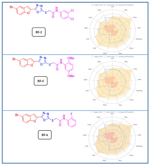Drug-likeness profile of Bromobenzofuran-oxadiazoles BF-2, BF-5 and BF-6.