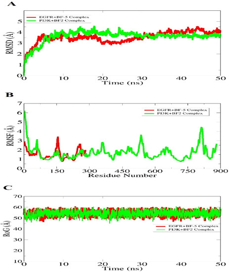The dynamics assessment of the most bioactive docked complexes PI3K+BF-2 and EGFR+BF-5 were done through a molecular dynamics simulation technique. The simulation trajectories were studied for the structural stability of bromobenzofuran-oxadiazoles with receptors via the root mean square deviation (RMSD), root mean square fluctuation (RMSF), and radius of gyration (RoG). All of these analyses were done based on carbon alpha atoms. Generally, all the analyses predicted the very stable formation of stable complexes. RMSD plots (A part of Figure 11) reported the very stable behavior of the PI3K+BF-2 complex throughout the simulation time while the EGFR+BF-5 complex initially experienced some deviation in the first 35 ns. The RMSD of both system maxima touches 4 angstroms. This was also complemented with an RMSF analysis, which complemented the RMSD findings and found the receptors residues in the presence of compounds very stable (B part of Figure 11). The PI3K+BF-2 complex receptor reported the C-terminal being very flexible compared to the rest of the enzyme structure. The RoG analysis was another confirmation of the RMSD findings and unveiled the systems to have compact nature in the compound’s presence.