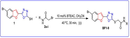 A reaction mixture containing bromobenzofuran-oxadiazole-2-thiol 1 (1 mmol) [35,36], BTEAC (10 mol%), and substituted bromoacetanilide derivatives 2a–i (1.2 mmol) [35,36] in CH3CN was sonicated for 30 min at 40 °C (Scheme 1). Upon reaction completion, n-hexane was added to afford S-arylated bromobenzofuran-oxadiazole derivatives BF1-9 as precipitates, which were further purified with an ethanolic recrystallization process or column chromatography technique using ethyl acetate–petroleum ether (1:9) [37,38,39].