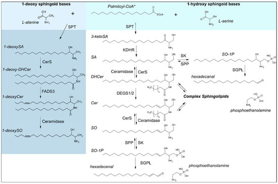 Sphingoid base biosynthesis. Synthesis of canonical (1-hydroxy) sphingoid bases is catalyzed over the condensation of acyl-CoAs, shown here with the preferred substrate* palmitoyl-CoA (C16:0), with L-serine by serine palmitoyltransferase (SPT) as the rate limiting step in de novo synthesis. 1-deoxy sphingoid bases are likewise synthesized by SPT, using the alternative substrate L-alanine. Enzymes involved are as follows: CerS: ceramide synthases, DEGS1/2: Dihydroceramide desaturases 1/2, FADS3: fatty acid desaturase type 3, KDHR: 3-ketoreductase, SGPL: sphingosine-1-phosphate lyase, SK: sphingosine kinase, SPP: S1P phosphatase, SPT: serine palmitoyltransferase. Substrates and products are abbreviated as follows: Cer: ceramide, DHCer: dihydroceramide, SA: sphinganine, SO: sphingosine, SO-1P: sphingosine-1-phosphate.