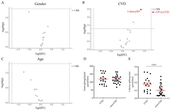 Gender, age and CVD effect on plasma sphingolipid profile. Volcano plot of the 13 sphingoid base species identified by LC–MS/MS according to gender (A), pre-existing cardiovascular disease (CVD) in individuals irrespective of DILI diagnosis (B), and age (≤50 vs. >50) (C). The fold-change of concentration is reported on the x-axis, the significance (p-value) on the y-axis. The vertical and horizontal dotted lines show the cut-off of fold-change = ±1.5, and of p-value = 0.05, respectively. Plasma level of total sphingolipids (D) and 1-deoxy-sphingosine (1-deoxySO) (E) in individuals with pre-existing cardiovascular disease (CVD group) and in those without CVD (non-CVD group). Data are expressed as mean ± SEM. The comparison of the means was performed by unpaired Student t-test. In scatter plot representation, each dot represents one individual sample. NS: not significant, UP: significantly increased.