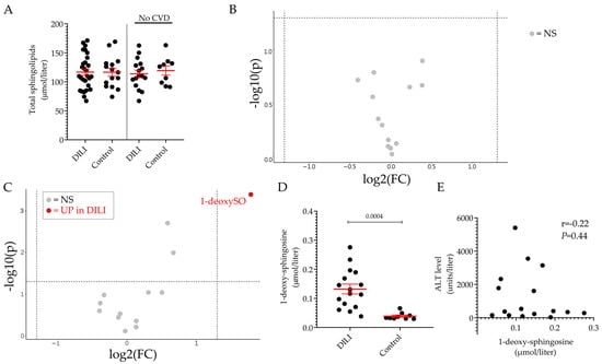 Plasmatic sphingolipid profile of individuals DILI patients and healthy volunteers. Total sphingolipid levels in DILI and control groups. Results are expressed as the mean ± SEM, where each dot represents one individual sample. Comparison of the means was performed by unpaired t-test (A). Volcano plot of the 13 sphingoid base species identified by LC–MS/MS between DILI and control groups (B) and between the non-CVD respective subgroups (C). The fold-change of concentration is reported on the x-axis, the significance (p-value) on the y-axis. The vertical and horizontal dotted lines show the cut-off of fold-change = ±1.5, and of p-value = 0.05, respectively. Plasma level of 1-deoxy-sphingosine (1-deoxySO) in non-CVD DILI and control groups (D). Pearson’s correlation analysis between ALT values and 1-deoxysphingosine in the non-CVD DILI group (E). NS: not significant, UP: significantly increased.