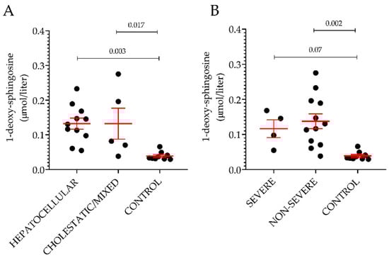 Plasma level of 1-deoxysphingosine according to type and severity of the injury. Classification was done based on the R ratio (A) or on the nR Hy’s law (B). Results are expressed as the mean ± SEM, where each dot represents one individual sample. Comparison of the means was performed by unpaired t-test.
