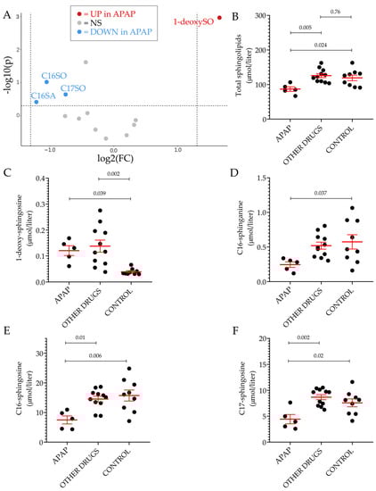 Plasmatic sphingolipid profile of patients with acetaminophen intoxication. Volcano plot of the 13 sphingoid base species identified by LC–MS/MS between individuals who experience APAP intoxication and the control group, excluding patients and controls with underlying CVD (A). The fold-change of concentration is reported on the x-axis, the significance (p-value) on the y-axis. The vertical and horizontal dotted lines show the cut-off of fold-change = ±1.5, and of p-value = 0.05, respectively. Scatter dot plot of total sphingolipid (B), 1-deoxysphingosine (C), C16-sphinganine (D), C16-sphingosine (E) and C17-sphingosine (F) levels in the indicated groups. In all scatter dot plots, results are expressed as the mean ± SEM, where each dot represents one individual sample. Comparisons of the means was performed by one-way analysis of variance (ANOVA) followed by Tukey’s multiple comparisons test. NS: not significant, UP: significantly increased. DOWN: significantly decreased.