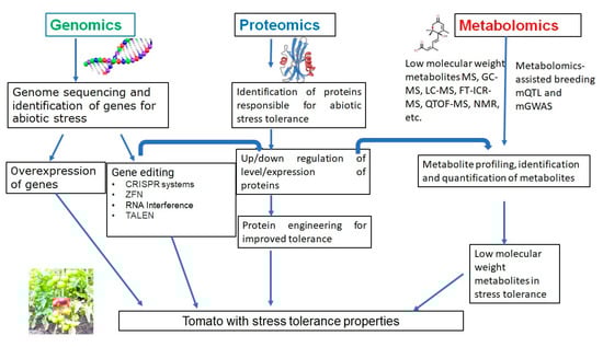 Introduction to advanced technology has resulted in the appearance of various multidimensional omics disciplines, including genomics, transcriptomics, proteomics, metabolomics, etc., which deal with the molecular components of cellular life. The advancements in genomic studies have aided in the discovery of various gene families and mechanisms that affect tolerance to abiotic stressors and hence boost yield. These genes may be part of protein kinases such as mitogen-activated or calcium-reliant, and they further activate transcription factors (TFs) and cis-acting elements that regulate stress-response patterns [6]. Moreover, combined research on plant–environment interactions provides a comprehensive perspective of molecules at the cellular, tissue, or organism level [7]. The integration of several omics techniques that provide significant biological information is being tackled through system biology, a relatively emerging discipline of life science. Systems biology in combination with virtual experiments provides visualization and comprehension of how plants cope with abiotic stress [8]. In addition, designing climate-smart cultivars for high and steady production in unfavorable climatic situations necessitates the integration of multidisciplinary expertise. In this regard, the current study presents detailed information on recent breakthroughs in proteomics, as well as strategies for the effective investigation of accessible resources in tomatoes dealing with abiotic stress resistance.