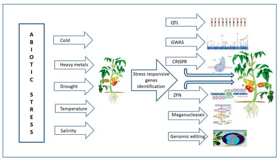 Figure 4. Schematic illustration of the usage of genomic approaches for making abiotic stress-tolerant tomato plants. The abiotic-stressed tomato plant shows restricted growth, while the plant with gene editing exhibits vigorous growth under abiotic stresses. QTL—quantitative trait loci; GWAS—genome-wide association studies; CRISPR—clustered regularly interspaced short palindromic repeats; ZFN—zinc-finger nucleases.