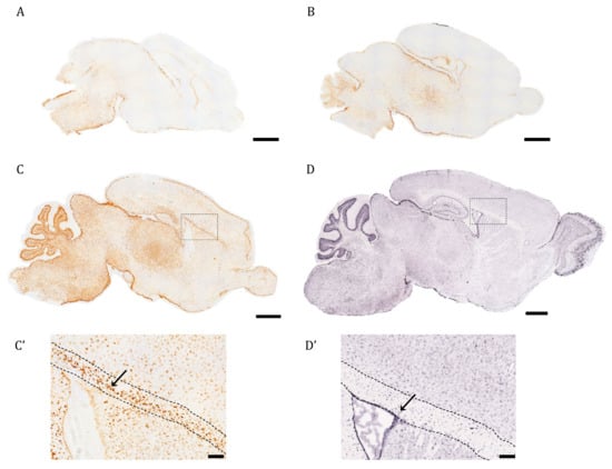 The ISH image of AQP4 mRNA for a young adult animal (P60) presented in Figure 1D,D′ comes from the Allen Mouse Brain Atlas [19]. There, we can see that the AQP4 transcript is expressed in areas where the presence of the protein is well known for adult mice: the glia limitans, intense expression in ependymal cells in the ventricle, and in the external layers of the cortex (Figure 1D,D′), while the labeling of its mRNA disappears almost completely from the CC, shown by the arrow in Figure 1D′, in contrast to what we observed on P7 (Figure 1C,C′). In the cerebellum, the signal now occurred in the outer layers of the crest, removing the labeling from the most internal white matter zone of the crests in this organ (Figure 1D). That is, in the adult animal, there is an enrichment of the labeling towards cortical areas rich in gray matter, and meanwhile the signal is lost from the highly myelinated areas of the WM.