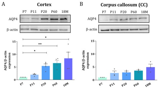 Adult brain undergoes an AQP4 protein increase in the cortex but remains at the same protein levels in corpus callosum. Western blot analysis of AQP4 protein amount at different age groups was performed in the cortex (A) and corpus callosum (B). Data shown are representative for 3 independent experiments. n = 3–5 animals per group. Mean values are represented with the standard error of the mean (SEM). Statistically significant differences between mean values were assessed by ANOVA test with post hoc TUKEY multiple comparison test (* p < 0.05, ** p < 0.01).
