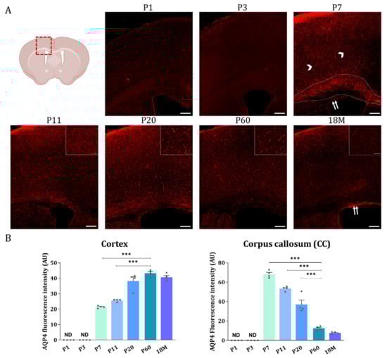 Quantification of the AQP4 signal from the immunofluorescence analysis detailed above was by the optical density of representative microphotographs of the different areas of the brain in each stage of development (Figure 4B). The intensity levels of the AQP4 protein show that, in the cortex the expression of AQP4 starts to be detectable at P7, and from there the expression of the protein continuously increases until the adulthood of the animal, a consistent result with the data shown before by western blot (Figure 3A). In contrast, in the corpus callosum the highest levels of the AQP4 protein were detected at P7 (Figure 4B), and from there its levels continuously decreased with the aging of the animal, therefore confirming that the AQP4 protein follows a similar inversion pattern of expression as that described before for its mRNA. i.e., large postnatal expression at P7, in the corpus callosum or white matter tissue, which will diminish or disappear during neurodevelopmental aging, while crescent expression of the protein from P7 through adulthood, in cortical gray matter tissue.