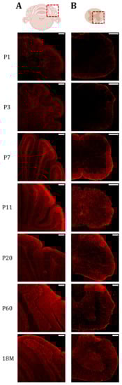 The brains of the animals at E16, P1, P3, P7, P11, P20, P60, and 18 months were fixed and obtained as previously described, cryoprotected in 30% sucrose in PBS, and included in OCT (Tissue-Tek). The spinal cords were additionally decalcified with 10% EDTA in PBS before the sucrose cryoprotection step. Coronal sections of 30 µm were cut on a cryostat (Leica, Wetzlar, Germany). The immunofluorescence of fibrillary acid protein (GFAP) and AQP4 was performed as previously described [30,31], using monoclonal anti-GFAP (1:300; Sigma) and polyclonal AQP4 (1:100; α-diagnostic, San Antonio TX, USA). Anti-mouse IgG conjugated with Alexa Fluor488 (1:400; Invitrogen) and anti-rabbit IgG conjugated with Cy3 (1:200; Jackson-Immunoresearch, Cambridgeshire, UK) were used as secondary antibodies for GFAP and AQP4, respectively. The tissue slices were mounted with Fluoromount-G mounting medium. Simple fluorescent images of AQP4 were visualized using a Leica DMi8 inverted microscope, and GFAP colocalization images were acquired using a confocal microscope (Leica Stellaris 8) in a 0.5-um Z-stack series.