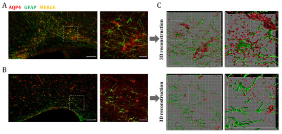 To quantify the abundance of AQP4 protein in the coronal sections, the optical density of the AQP4 + staining was measured using rhe NIH Image software (ImageJ, version 1.53t). For this study, three slices per mouse were included. These slices were representative of the cerebral region comprised between +0.62 and −0.10 mm rostro-caudal relative to the Bregma point in the Franklin and Paxinos mouse brain stereotaxic atlas. After defining the properties for a specific ROI, the area of the explored regions (corpus callosum and cortex) was randomly chosen and quantified. To perform the 3D reconstruction analysis of the AQP4/GFAP immunofluorescence micrographs, the software Imaris (Bitplane, version 6.0) was used.