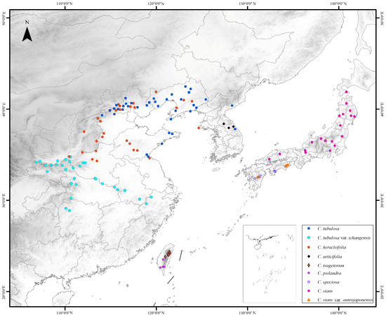 Species of sect. Tubulosae occur solely in East Asia [40,44]. With the exclusion of C. takedana and C. pinnata (C. tartarinowii as its synonymy) [47], seven species and two varieties were included in the sect. Tubulosae [44], which were widely distributed in mainland China (mainly in northern and eastern provinces), Taiwan island, the Korean Peninsula, and the Japan archipelago (Figure 1). Three taxa, C. heracleifolia, C. tubulosa, and C. tubulosa var. ichangensis, occur in mainland China. The former two taxa are distributed in northern China and often occur together, whereas C. tubulosa var. ichangensis is distributed relatively in the south range of the sect. Tubulosae in Hubei, Henan, Hunan, Shaanxi, Shanxi, and Anhui Provinces, with some rare populations occurring in Guizhou and Zhejiang Provinces (Figure 1). The other six taxa are distributed in the Korean Peninsula and the insular system of East Asia, all of which are narrow endemics. Among them, one (C. urticifolia) is in the Korean Peninsula, three (C. stans, C. stans var. austrojaponensis, and C. speciosa) are in the Japanese archipelago, and two (C. psilandra and C. tsugetorum) are in Taiwan island. The historical origin of this East Asian section and the formation of its distribution patterns are interesting issues worthy of further investigation. In this study, we hypothesize that the species diversification and the range formation of sect. Tubulosae were triggered by topographical events and climate changes during the Plio-Pleistocene epoch, as suggested by previously published molecular dating analysis of the genus [43], and the island species of this section evolved allopatrically due to the intermittent land bridges in the East China Sea during the Quaternary ice ages.