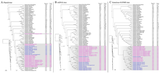 Clematis species have a considerably large genome size (more than 7 Gbp, https://cvalues.science.kew.org/search, accessed on 1 May 2022), and up to now, no information about high-quality whole genome sequences has been published. High-depth sequencing data to assemble nuclear genes is too expensive to be extensively applied to Clematis. Using genome skimming (approximately 1×) and transcriptome data, our recently published study [60] generated a robust phylogenetic framework of Clematis. Xiao et al. [60] revealed that the nuclear genome phylogeny was better resolved and better corresponded to the morphological classifications of Clematis than the plastome phylogeny. A high degree of incomplete lineage sorting (ILS) and frequent interspecific hybridization events may have been responsible for widespread cytonuclear discordance in the genus.