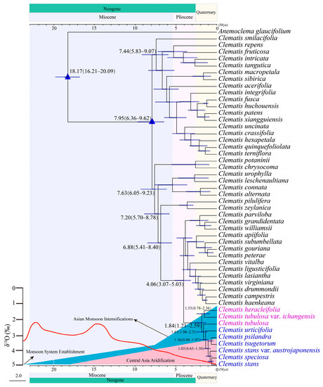 BEAST chronogram of Clematis sect. Tubulosae constructed by the SNPs sequences (Geneious-0.05MS, only one sample was kept for each species). The mean divergence times (Mya) and 95% high posterior density (HPD) are shown at the branches. Climatic events, including aridification of Central Asia (pink shade), the establishment of a monsoon system (blue shade), and a global average δ18O curve (leaf-hand axis) derived from benthic foraminifera which mirror the major global temperature trends during the 23 Mya (red line) [7,62,63] are shown below the tree. Samples of sect. Tubulosae are highlighted with color, as in Figure 2. Blue triangles are calibration points.
