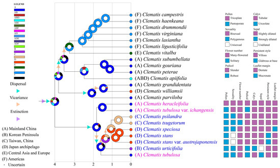 Ancestral range reconstructions of Clematis sect. Tubulosae inferred by the SNPs sequences (Geneious-0.05MS) using BioGeoBEARS implemented in RASP. Samples of sect. Tubulosae are highlighted with color, as in Figure 2. Morphological characters and their states were marked at the right side of the tree.