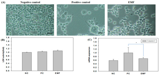 Figure 1. EMF exposure does not induce cellular damage. (A) Images of Raw 264.7 cells after EMF (10 G, 40 Hz) exposure. Scale bar, 100 μm. (B) Cellular stress (measured by LDH assay) and (C) apoptosis (measured by Caspase-3 expression) in Raw 264.7 cells after 4 days of EMF exposure. EMF, electromagnetic field; LDH, lactate dehydrogenase. Negative control (NC), cells grown in growth media (undifferentiated); positive control (PC), cells grown in differentiation media (with RANKL); EMF, cells grown in differentiation media (with RANKL) with EMF exposure. The symbol * indicate a significant difference with p < 0.05.