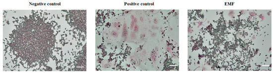 After four days of EMF irradiation, Raw 264.7 cells were washed with PBS and immobilized in 4% paraformaldehyde (PFA) for 10 min. Subsequently, the cells were stained using a TRAP staining kit (Takara, Vero Beach, FL, USA) according to the manufacturer’s instructions.