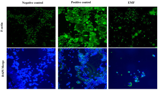 Figure 3. EMF-modulated actin formation. FITC-conjugated phalloidin staining in Raw 264.7 cells differentiated into osteoclasts for 4 days in differentiation media (with 50 ng/mL RANKL) with or without EMF exposure. The images were acquired at 100× magnification. Negative control, cells grown in growth media (undifferentiated); positive control, cells grown in differentiation media (with RANKL); EMF, cells grown in differentiation media (with RANKL) with EMF exposure.