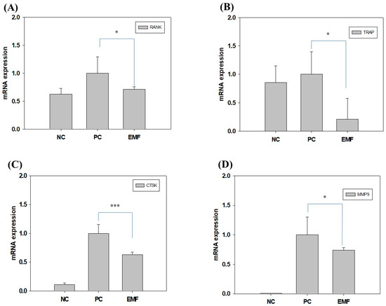 Figure 4. EMF regulates the expression of osteoclastogenic markers. Expression levels of (A) RANK, (B) TRAP, (C) CTSK, and (D) MMP9 were determined by RT-qPCR in Raw 264.7 cells differentiated for 4 days in differentiation media (with RANKL) with or without EMF exposure. NC, cells grown in growth media (undifferentiated); PC, cells grown in differentiation media (with RANKL); EMF, cells grown in differentiation media (with RANKL) with EMF exposure. The symbols * and *** indicate significant differences with p < 0.05 and p < 0.005, respectively.