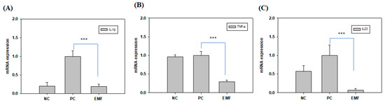 Figure 5. EMF-induced changes in cytokine expression. Expression levels of (A) IL-1β, (B) TNF-α, and (C) IL-23 were determined by RT-qPCR in Raw 264.7 cells differentiated for 4 days in differentiation media (with RANKL) with or without EMF exposure. NC, cells grown in growth media (undifferentiated); PC, cells grown in differentiation media (with RANKL); EMF, cells grown in differentiation media (with RANKL) with EMF exposure. The symbol *** indicates significant differences with p < 0.005.