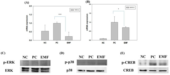 Figure 6. Regulation of the RANKL signaling pathway by EMF exposure. The mRNA levels of (A) TRPV4; and (B) NFATc1 and protein levels of (C) p-ERK, (D) p-p38, (E) p-CREB in Raw 264.7 cells differentiated for 4 days in differentiation media (with RANKL) with or without EMF exposure. NC, cells grown in growth media (undifferentiated); PC, cells grown in differentiation media (with RANKL); EMF, cells grown in differentiation media (with RANKL) with EMF exposure. The symbols * and *** indicate, respectively, significant differences with p < 0.05 and p < 0.005.