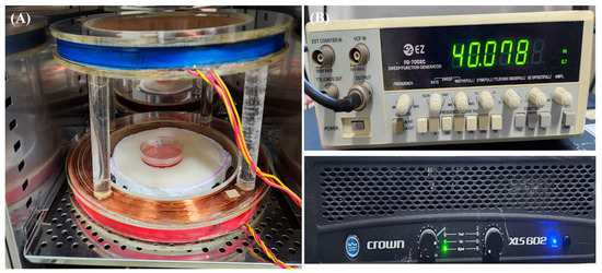 Figure 7. EMF stimulation device. (A) Helmholtz coils. (B) Function generator and amplifier. The coils were placed in a cell culture incubator (37 °C, 5% CO2). EMF, electromagnetic field.